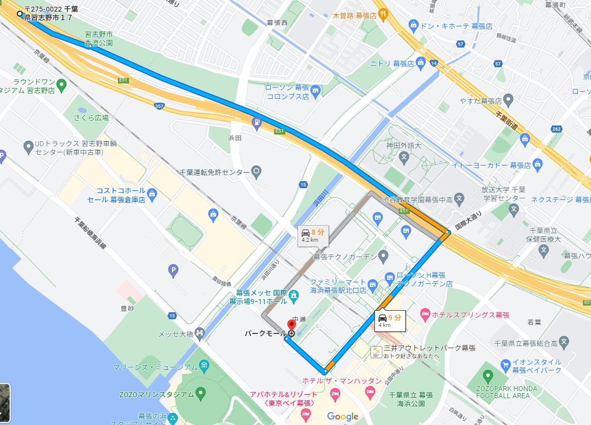 • 湾岸習志野ICを降りた後「国道357号」を直進する(ここは混雑する)。