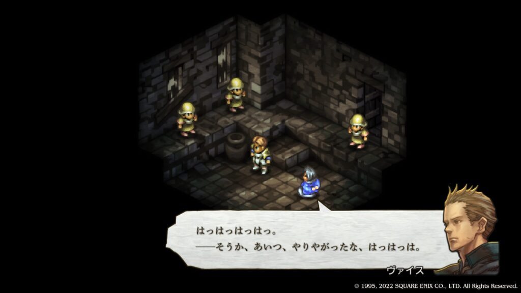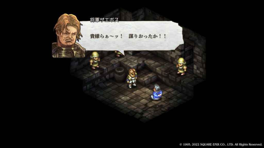 一方場面は変わり、スウォンジーの森でガルガスタン軍に敗れ、捕らわれて将軍ザエボスから尋問を受けているヴァイス。無論真面目なシーンなのだが、将軍ザエボスがリズミカルに鞭をピシピシやる姿でフフッと笑ってしまった。