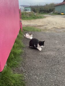 そしてこれは撫でられてるのを「何やってんだあいつら……」と見ている他の猫。長閑である。