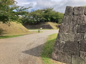 郭内への出入口となる3か所の本塁は、一部が石垣造りとなっています。特に正面の出入口となる南西側の本塁石垣は、他の場所の石垣より高く築かれていて、上部には「刎ね出し」とよばれる防御のための迫り出しがあります。