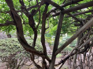 来た時と同じく藤棚を抜けて駐車場に戻る。堀には鴨が浮いていた。寒くないのだろうか。