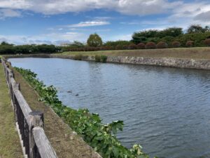 五稜郭の土塁は、掘割からの揚げ土を積んだもので、土を層状に突き固める版築という工法で造られています。